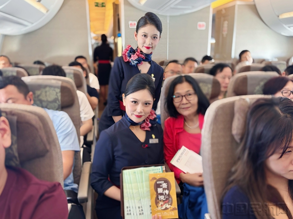 當(dāng)天的航程中,乘務(wù)組以“書香最抵人心,閱讀丈量世界”的特色廣播拉開序幕,帶領(lǐng)旅客踏上《典籍有意思·奇獸傳說》主題之旅。“上圖·凌燕”志愿服務(wù)隊成員手持《坤輿圖說》《營造法式》等典籍復(fù)刻卷軸,穿梭客艙為旅客們講述古籍中的瑞獸傳奇。